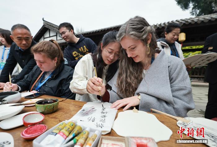 图为东北年夜教中邦语教院老师韩凯娜(左1)教写羊毫字。中新社记者 王磊 摄