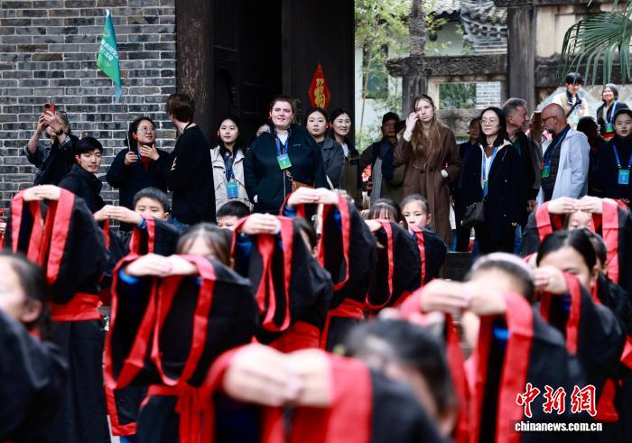 图为中好教者正在文庙旁观外地小教死上汉服礼节课。中新社记者 王磊 摄