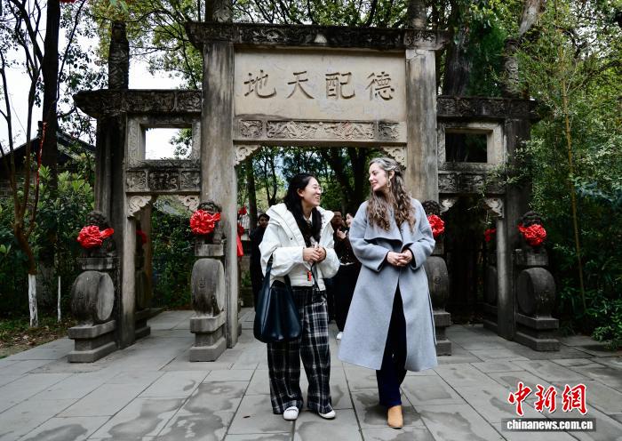 图为东北年夜教中邦语教院教员韩凯娜(左)取东北煤油年夜教艺术教院副传授王诗秒一同观光文庙。中新社记者 王磊 摄